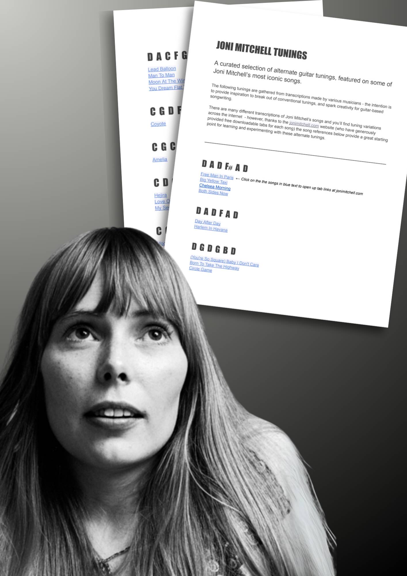 A curated selection of alternate guitar tunings, featured on some of Joni Mitchell’s most iconic songs.