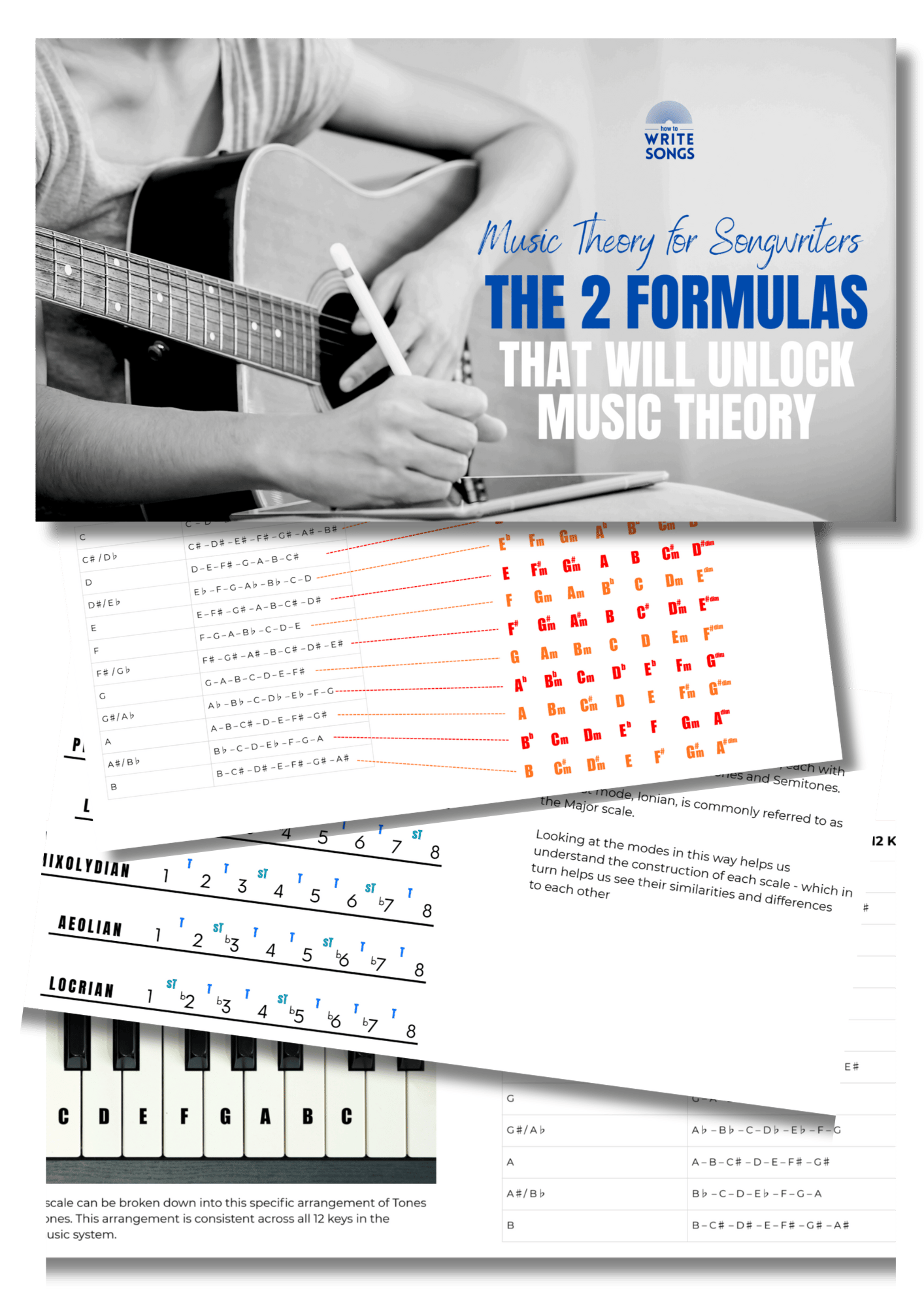 The 2 music formulas graphically depicted, with keys, modal scales, and chords written out for your reference.