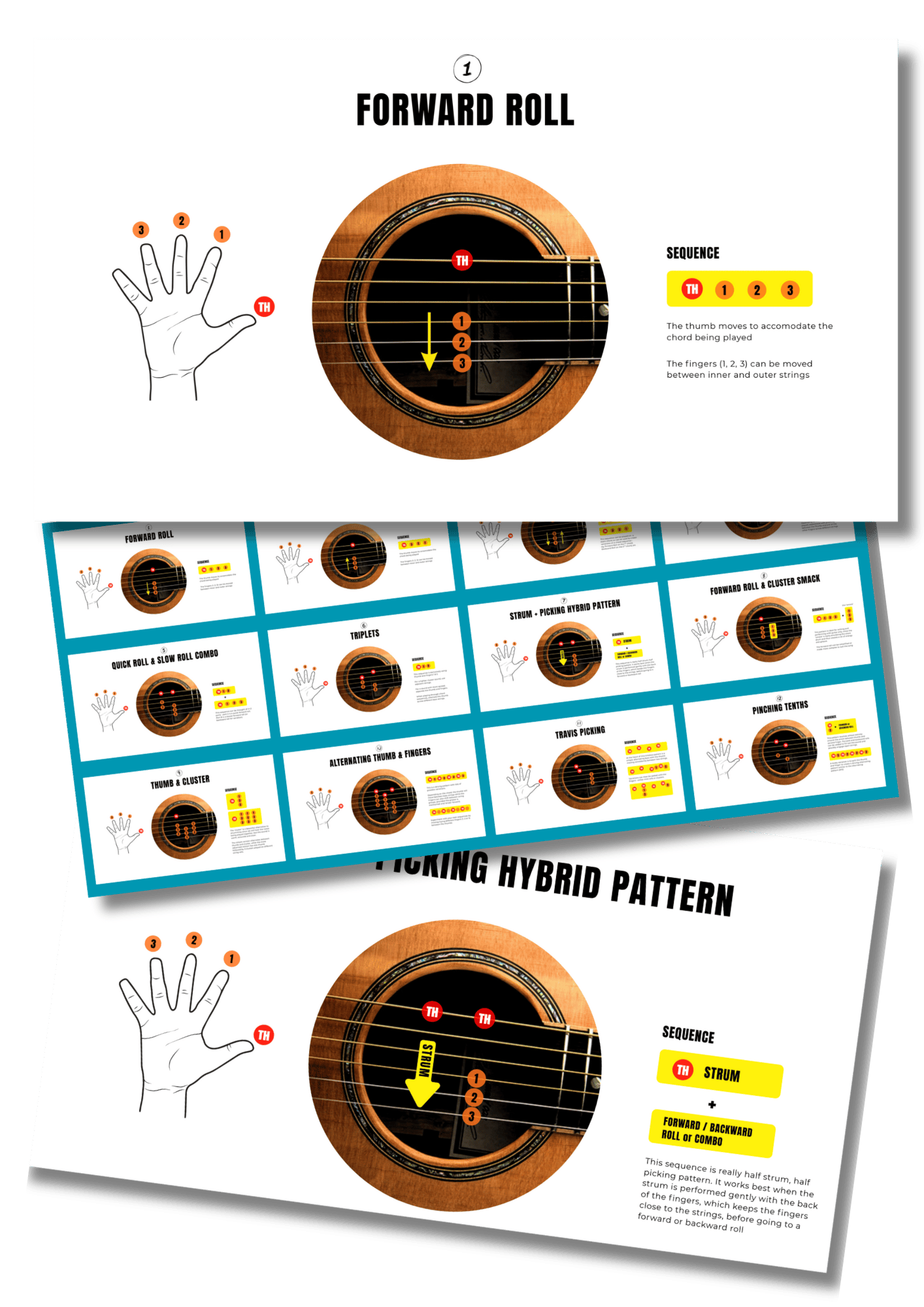 Get all 12 fingerpicking patterns with graphic illustrations and complete instructions.